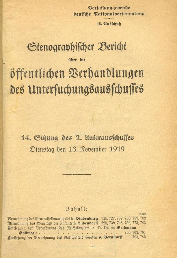 1918/1919 Hindenburg verlangt Waffenstillstand, verbreitet aber die Dolchstoßlüge