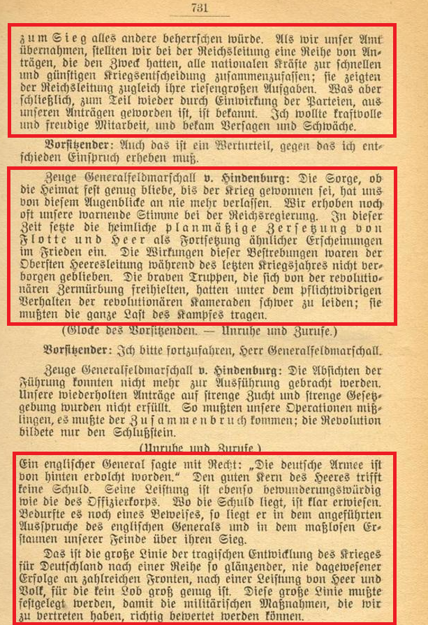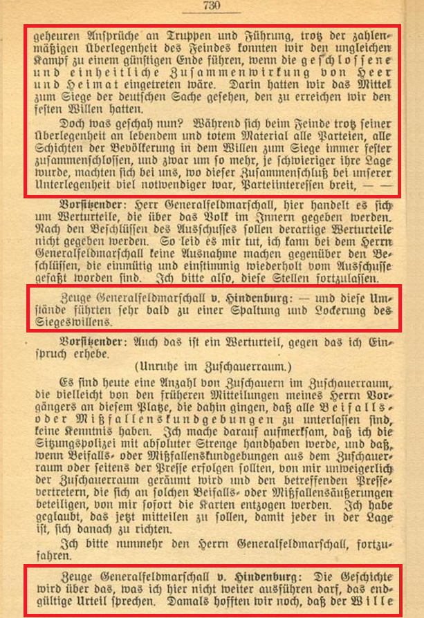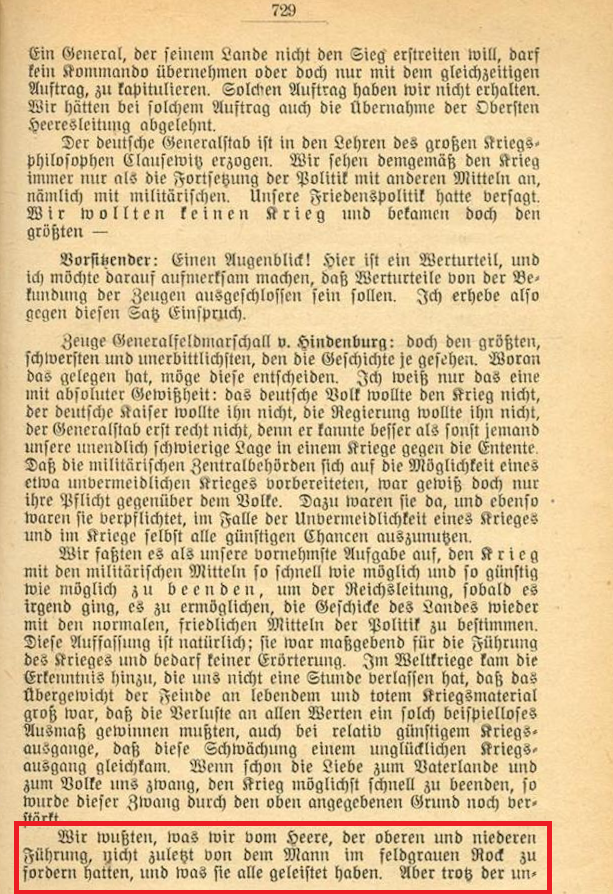 Nachdem sie mit Intrigen und Erpressung Chefs der Obersten Heeresleitung wurden und militärisch versagten, übernahmen Paul von Hindenburg (links) und Erich Ludendorff (rechts) trotz ihres militärischen Versagens keine Verantwortung. Im Gegenteil: Hindenburg verbreitete die Dolchstoßlüge und schob die Verantwortung den Parteien zu. Als Hindenburg vor dem Untersuchungsausschuß der Verfassungsgebenden deutschen Nationalversammlung aussagen musste, sagte er nachweisbar mehrfach die Unwahrheit: