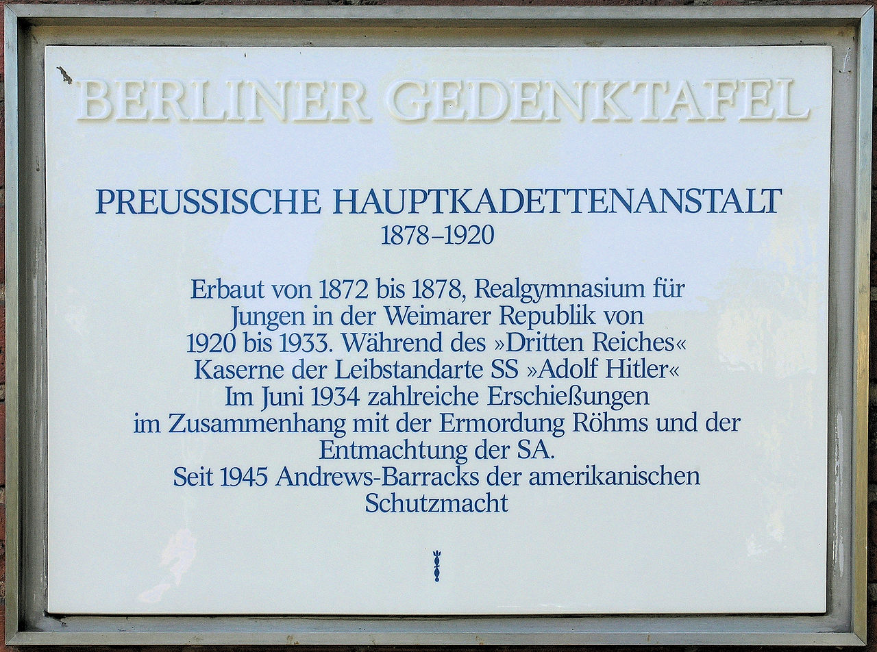 Berliner Gedenktafel am Haus Finckensteinallee 63–87 in Berlin-Lichterfelde, dem Gelände der ehemaligen SS-Kaserne Lichterfelde, in der ein Großteil der Berliner Opfer des Röhm-Putsches erschossen wurden (Autor Wikipedia, OFTW Berlin)