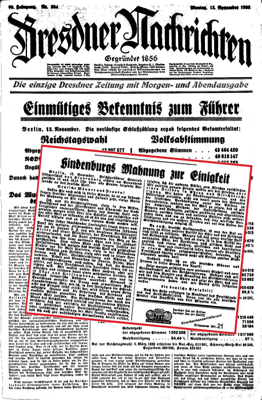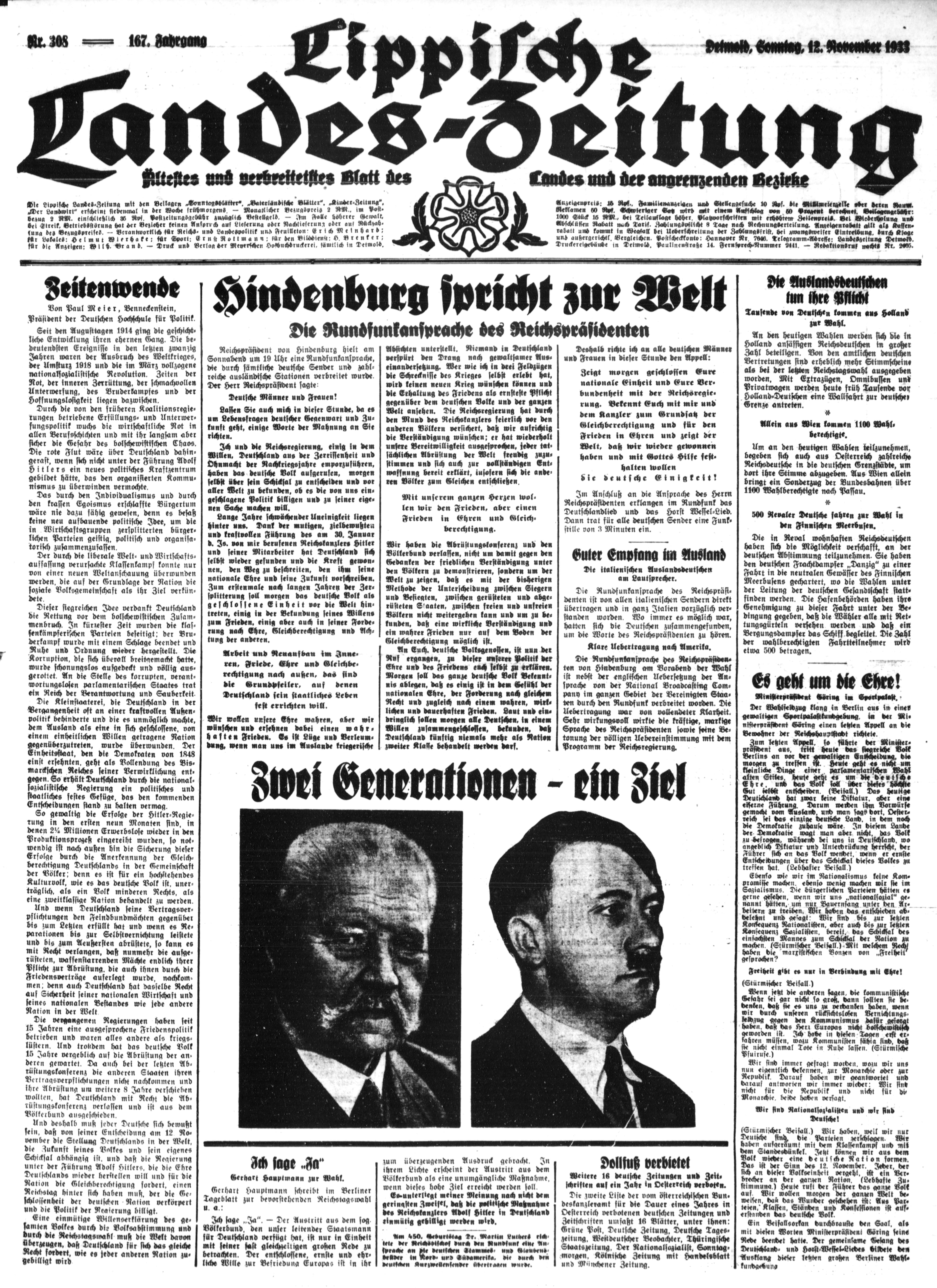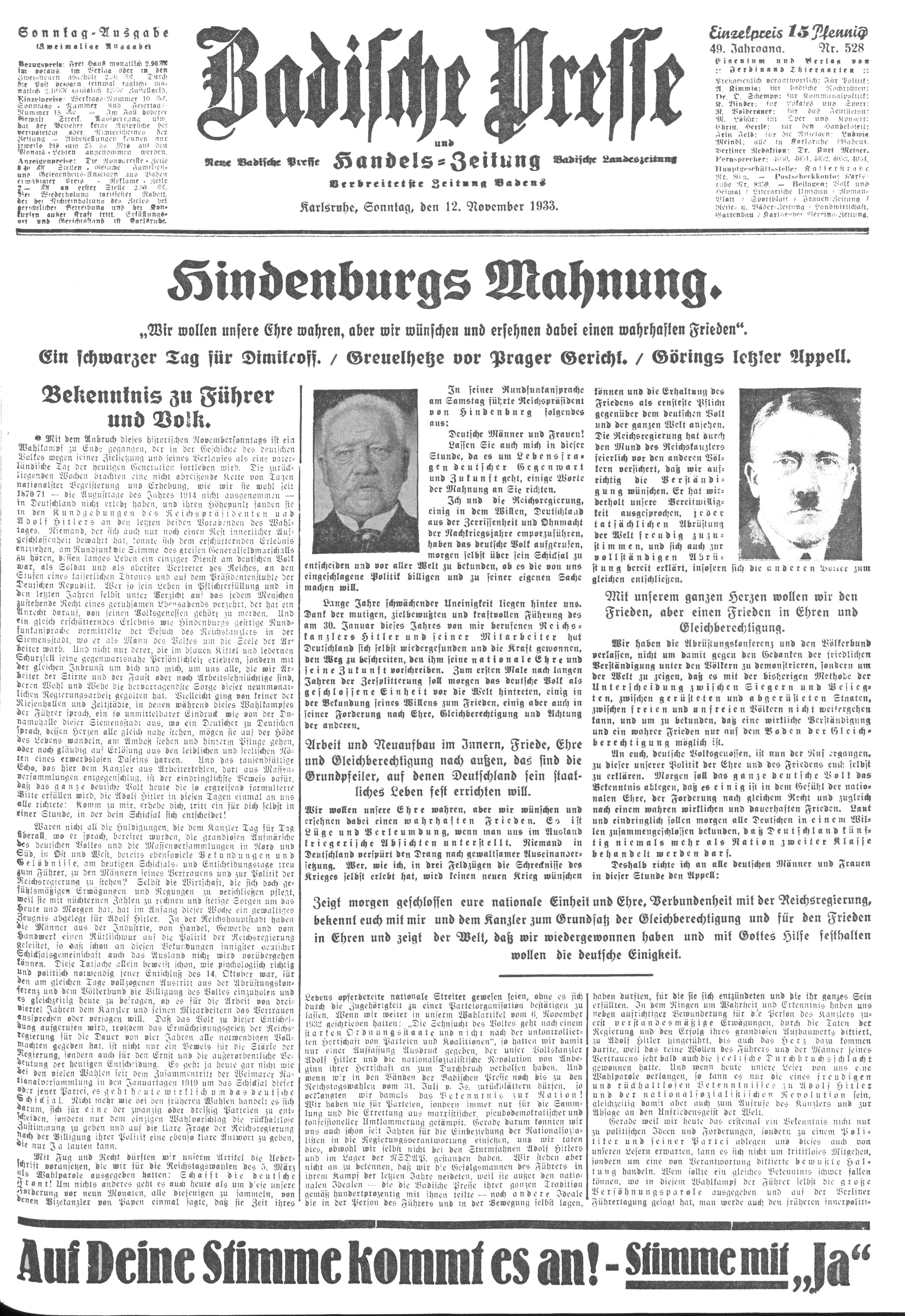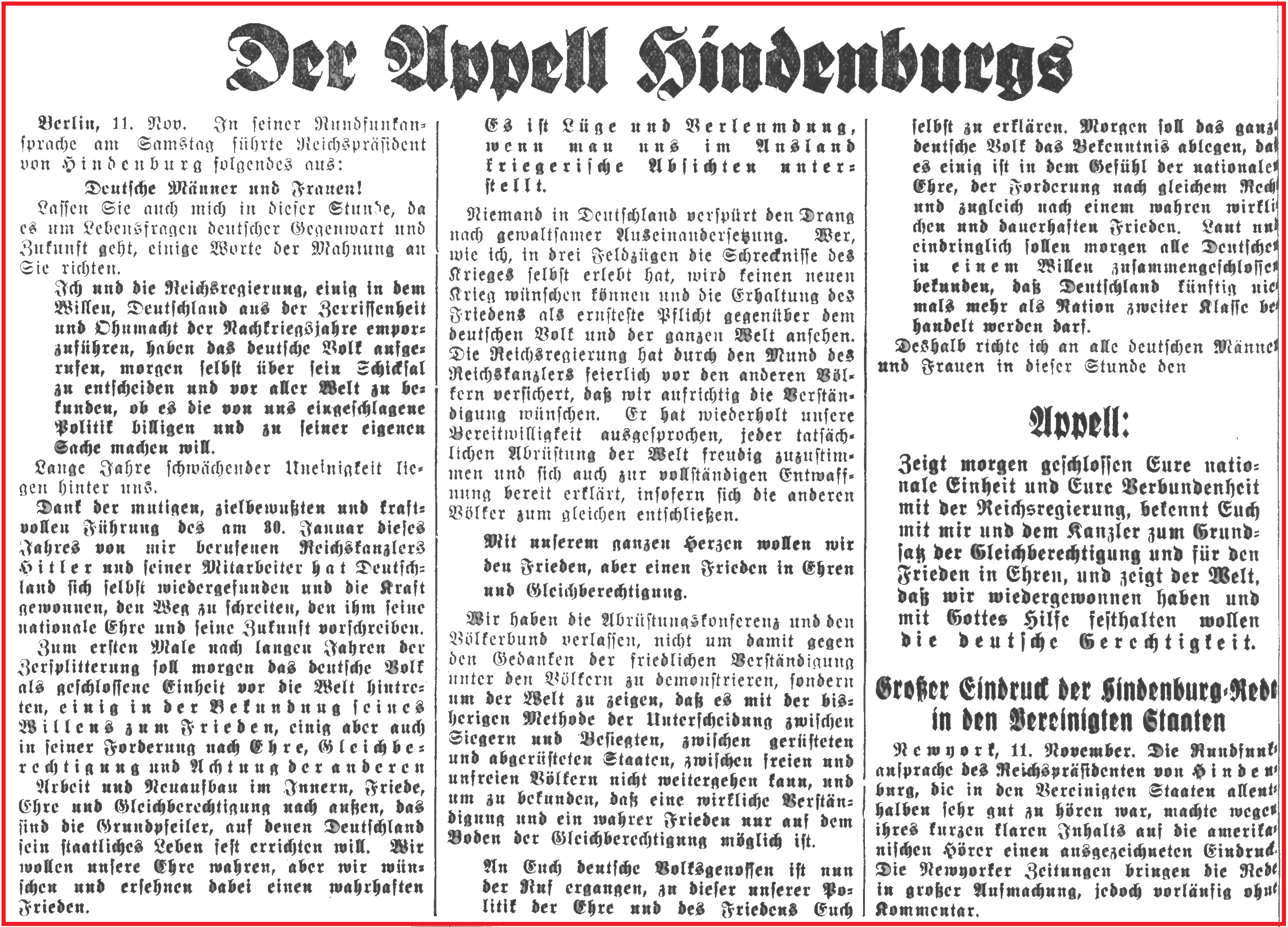 Die Hindenburgs Rede mit dem Aufruf zur Wahl der Nazis wurde im Radio ausgestrahlt und in vielen Zeitung wörtlich abgedruckt: Badische Presse - Generalanzeiger, Sonntagausgabe 12.11.1933, S. 1 Lippische Landes-Zeitung, 12.11.1933 S. 1 Die Nazi-Kampfblätter feierten Hindenburgs Wahlaufruf und druckten diesen ebenfalls ab, z.B. in Der Führer - das badische Kampfblatt für nationalsozialistische Politik und deutsche Kultur Hauptorgan der NSDAP 13.11.1933, S. 2 Dresdner Nachrichten, Frühausgabe 13.11.1933, S. 5